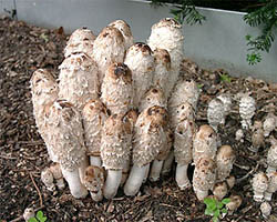 The horsetail fungus is also called shaggy ink cap, lawyer's wig, or shaggy mane. It has a rather scaly or flaky cap and usually grows in bunches or clusters, with some examples growing up to approx. 20 cm in height including the stalk. The stalk is hollow. When the fruiting body of the horsetail fungus is too mature, it melts into a black ink-like liquid.